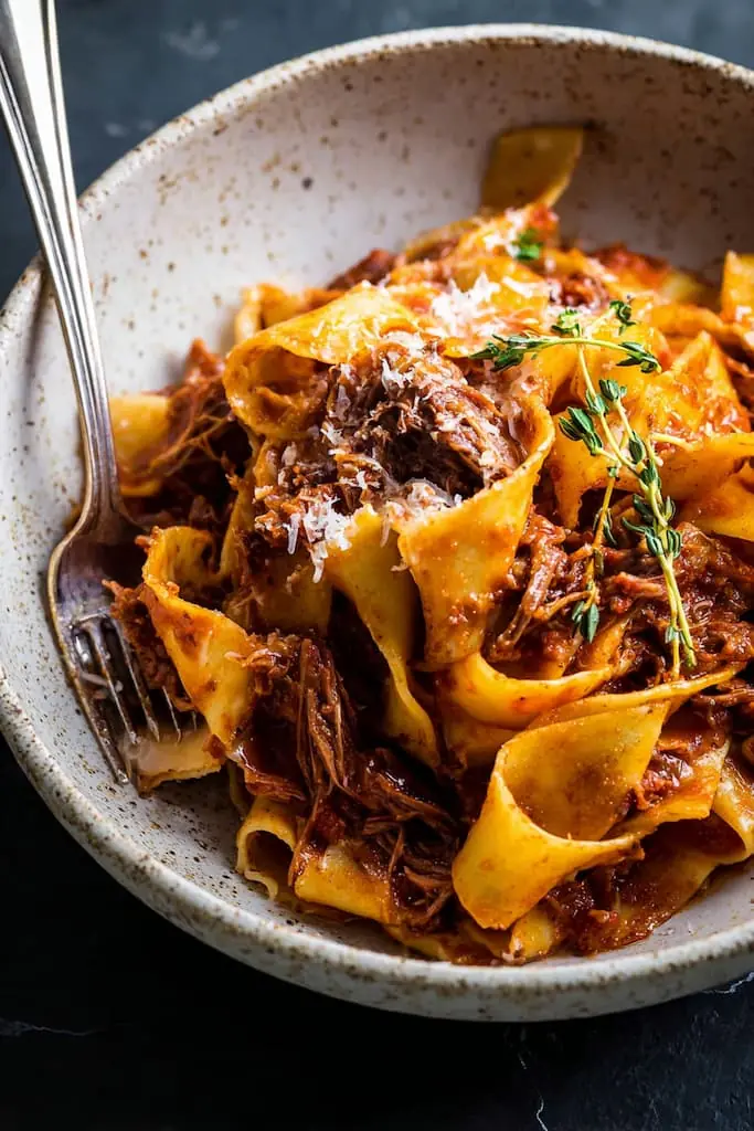 The kind of pasta that makes everyone slow down and really savor dinner. The short ribs break down into this incredibly rich sauce that clings to every strand of pappardelle. I start this on lazy Saturday afternoons and let it work its magic while I read or help with homework.